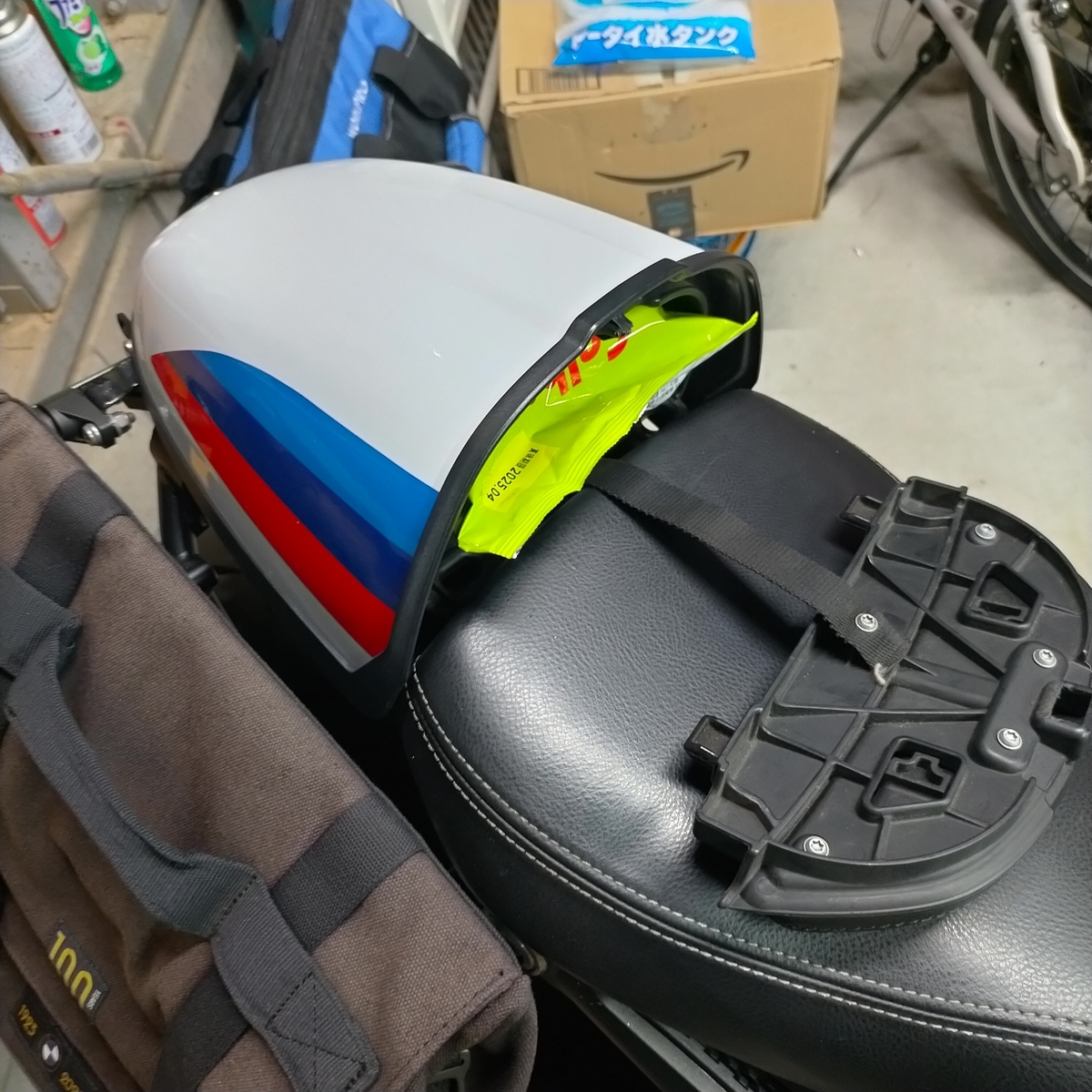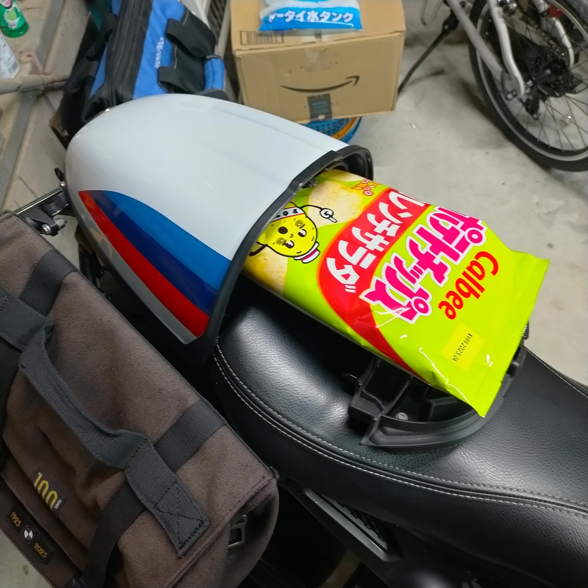 バイクに戻って、サイドバックに買い物袋を入れると、もうポテチを入れるスペースがありません